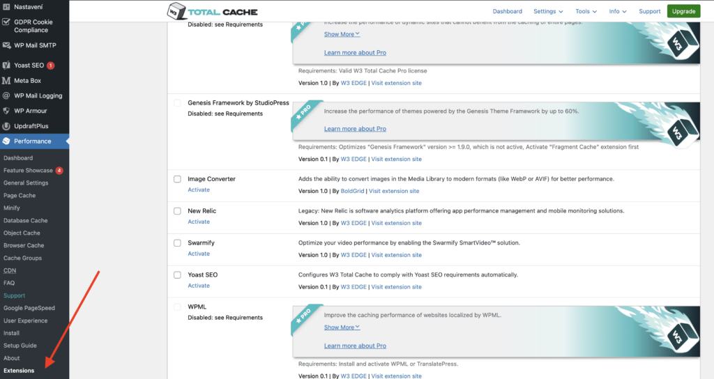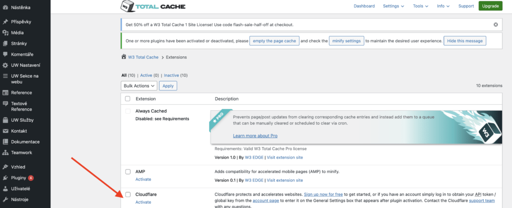 Nejprve v administraci WordPressu přejděte do Performance → Extensions. Tady najdete přehled dostupných rozšíření pro W3 Total Cache. V seznamu vyhledejte Cloudflare a klikněte na Activate.