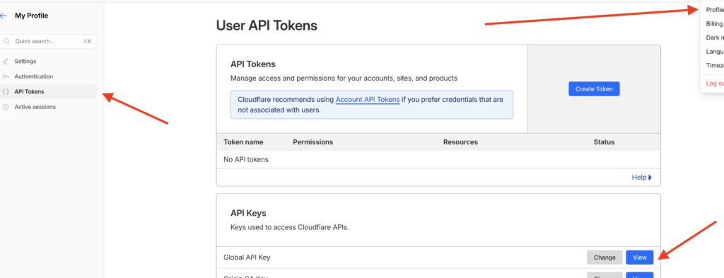 Tyto údaje najdete přímo v Cloudflare administraci. Vpravo nahoře otevřete svůj profil, přejděte do sekce API Tokens a níže v části API Keys klikněte u položky Global API Key na View. Tím se zobrazí klíč, který následně vložíte zpět do W3 Total Cache spolu s e-mailovou adresou.